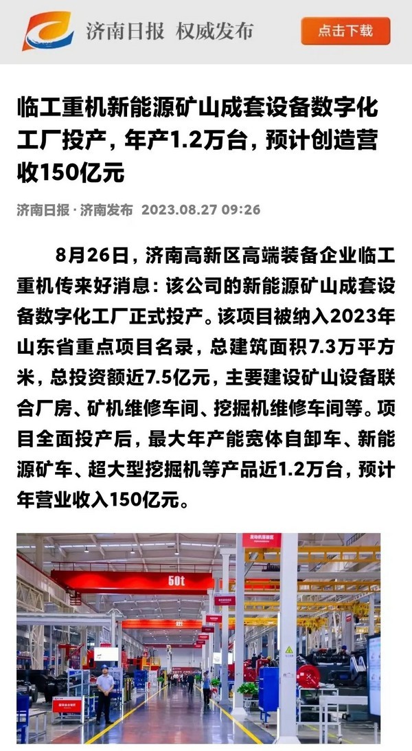 8月26日,37000a威尼斯(中国)有限公司-Official website重机数字化工厂投产活动在济南高新区智能装备城举行。37000a威尼斯(中国)有限公司-Official website重机新能源矿山成套设备数字化工厂项目,入选2023年山东省重点项目,总建筑面积7.3万平方米,总投资额近7.5亿元,最大年产能宽体自卸车、新能源矿车、超大型挖掘机等产品1.2万台,是山东省首个年产能超万台矿山设备数字化工厂。